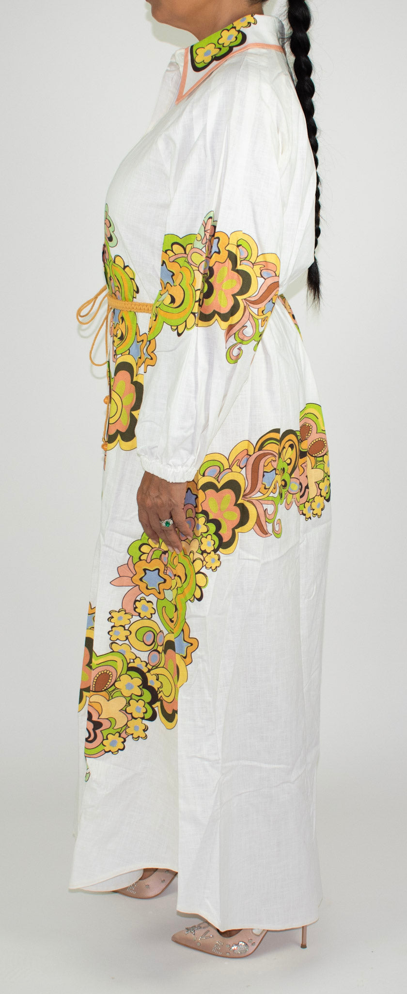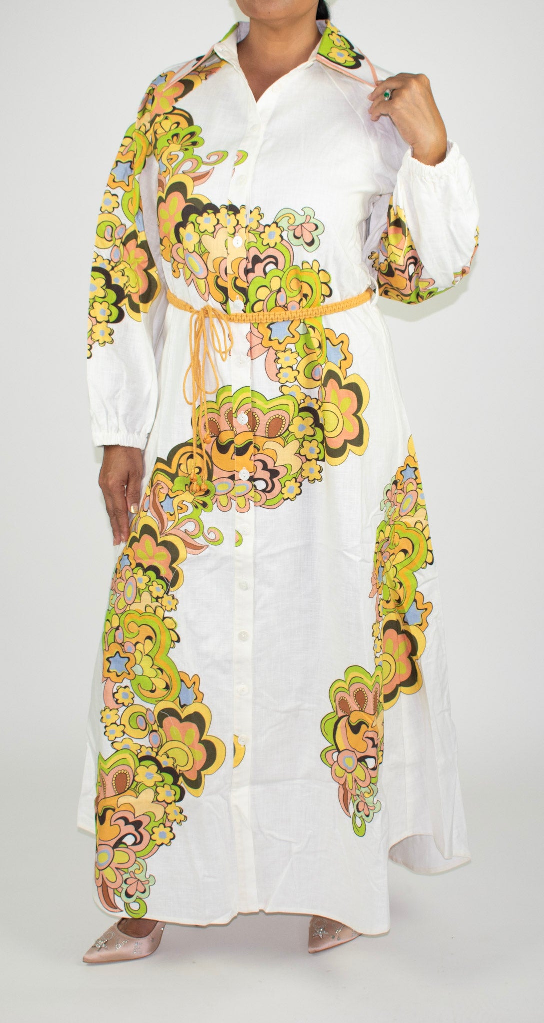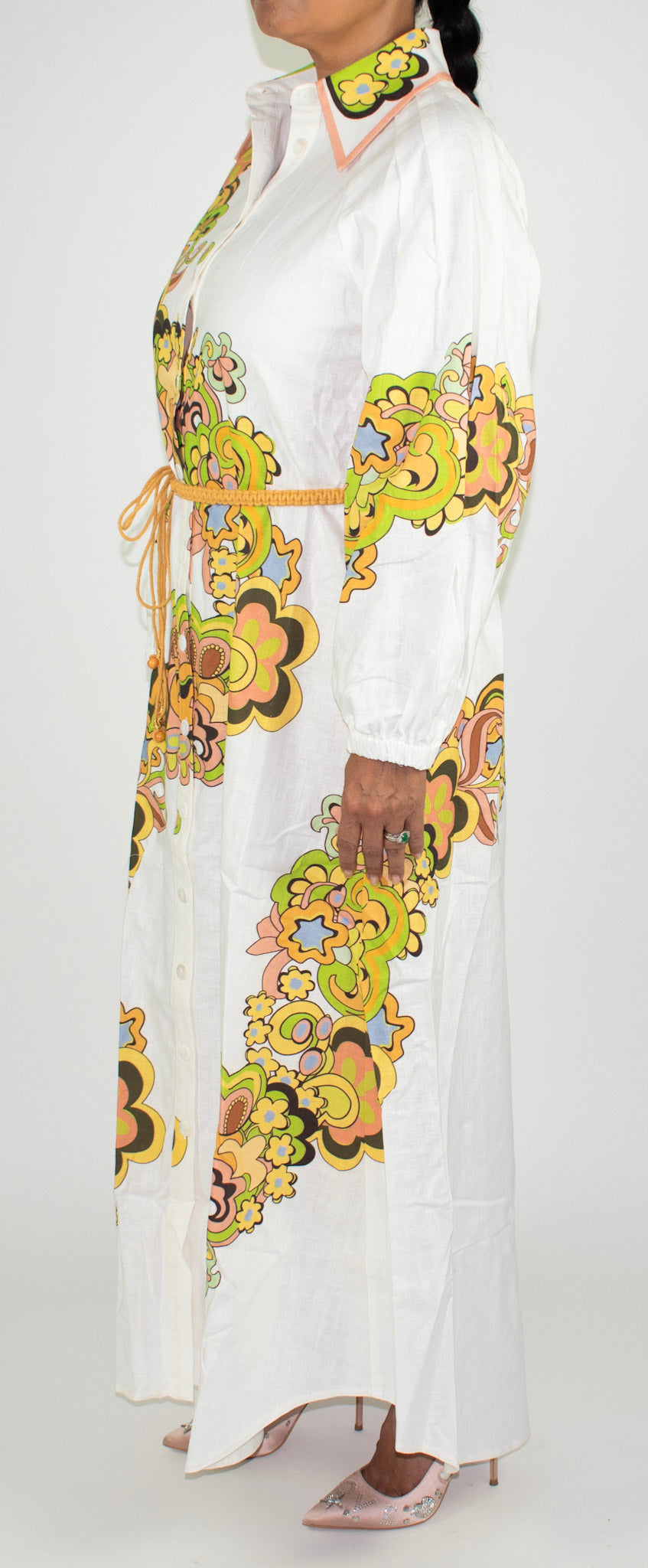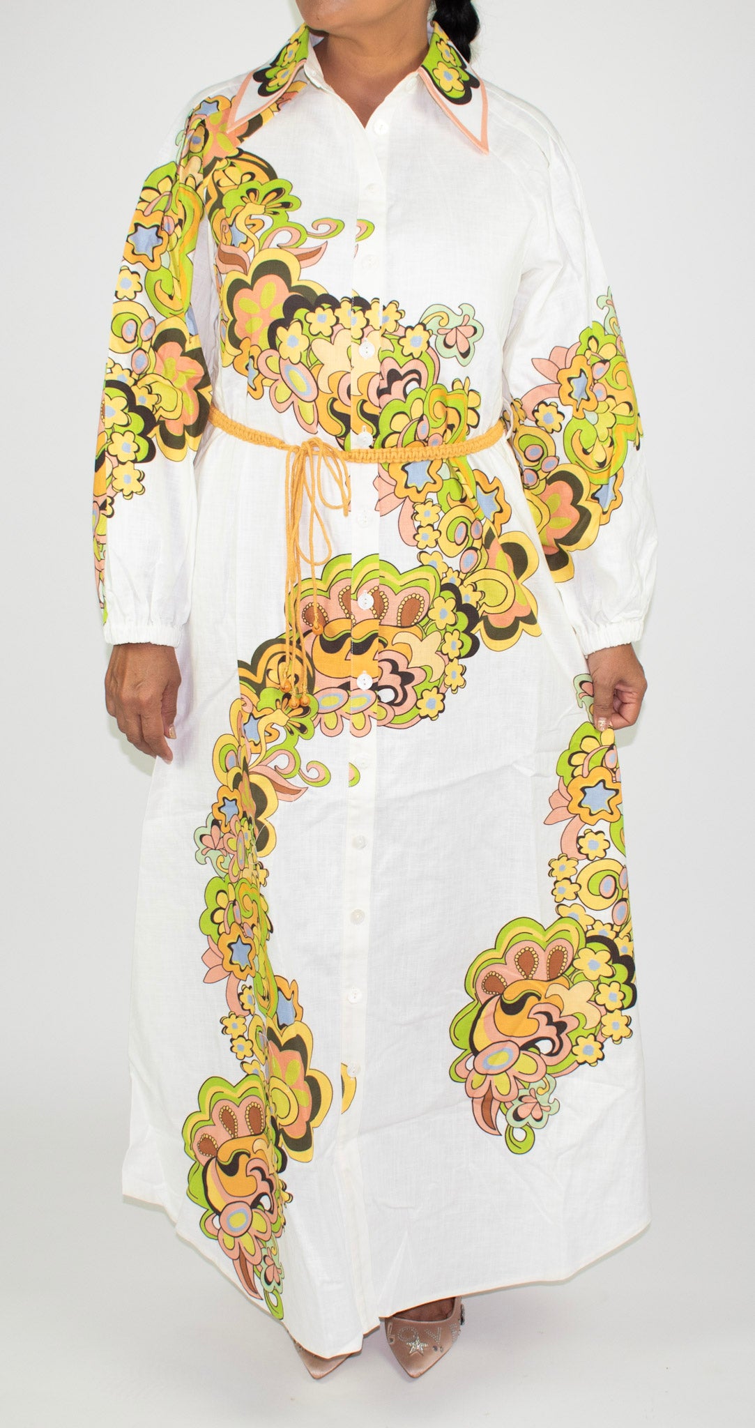 Beautiful full length, long sleeved dress in white with a yellow floral print.