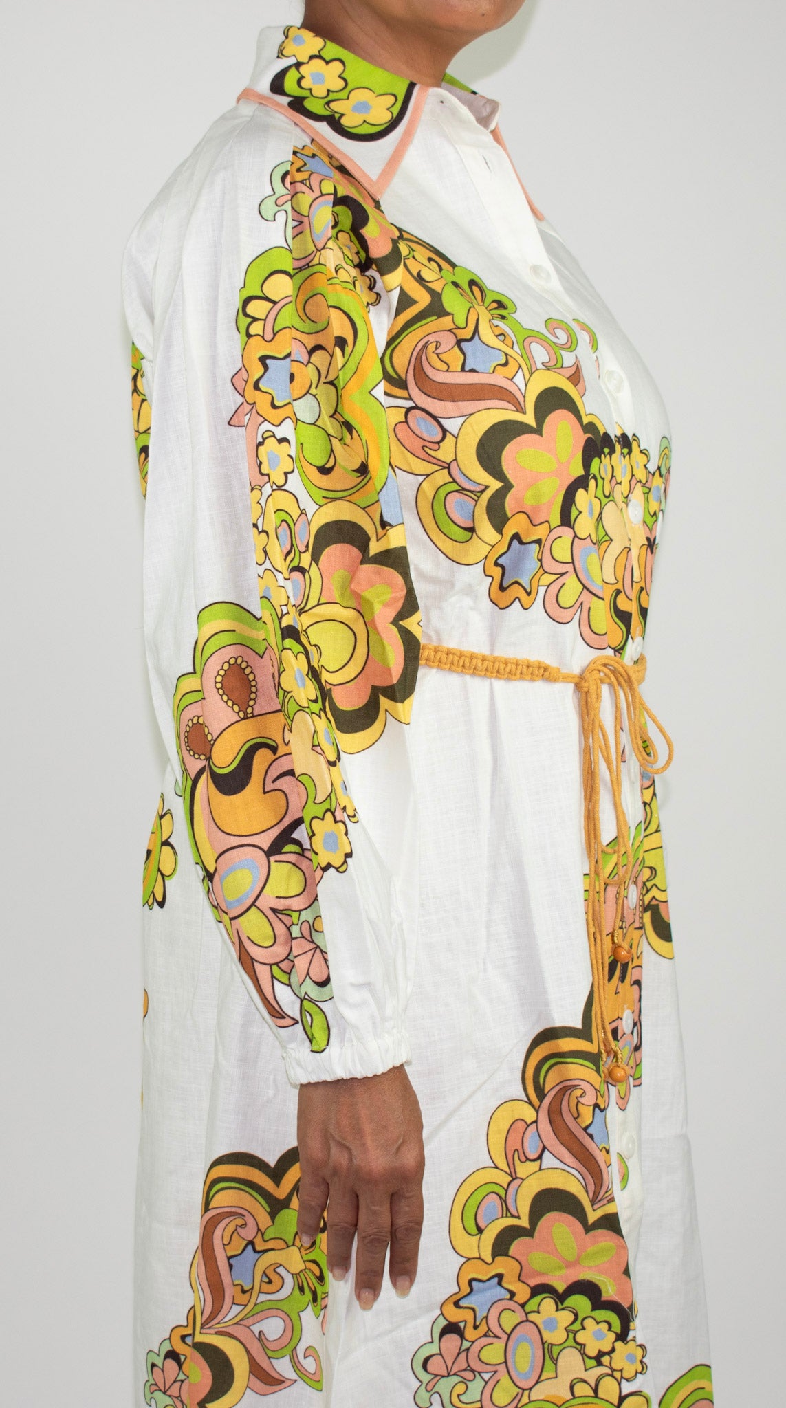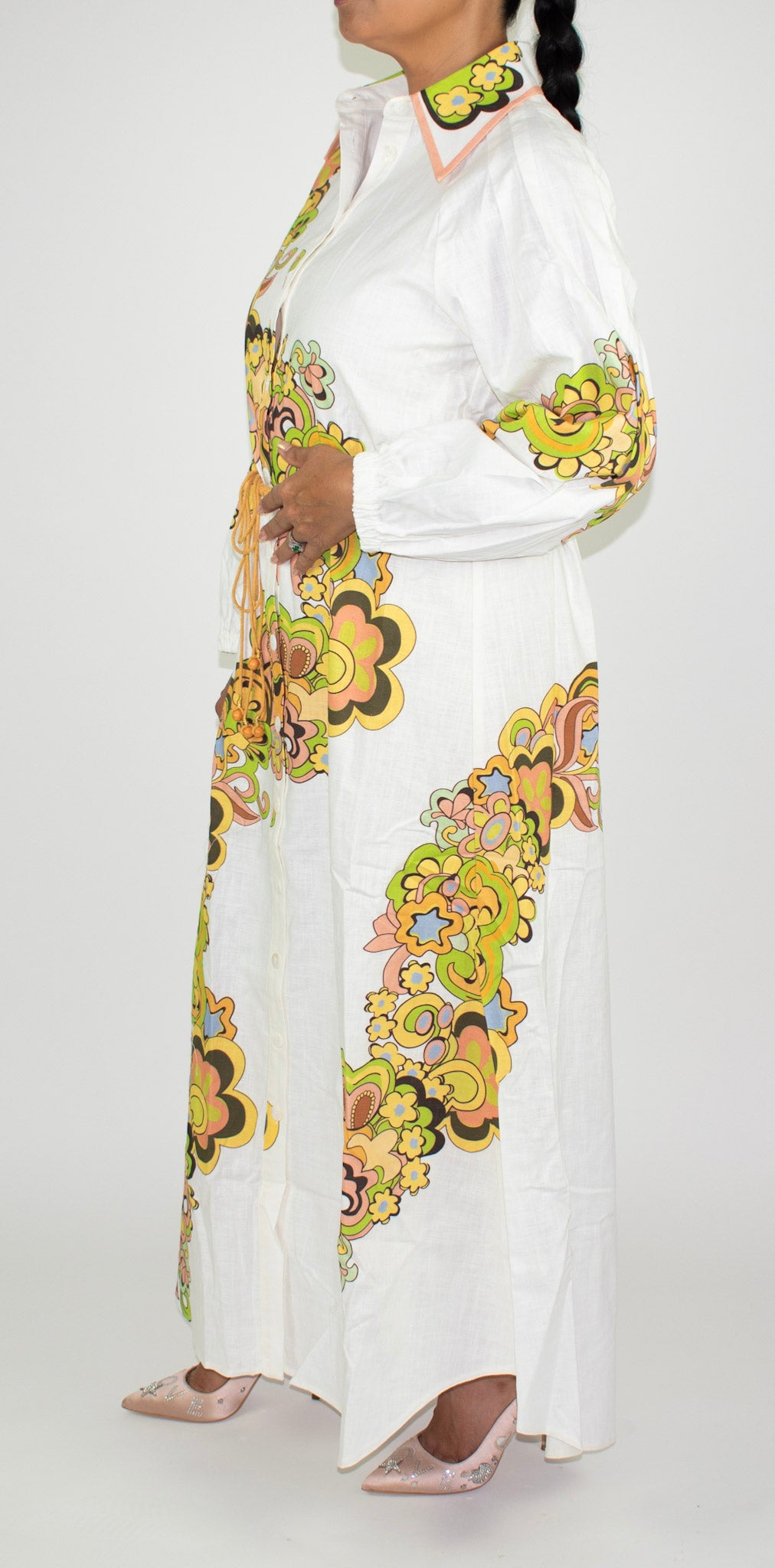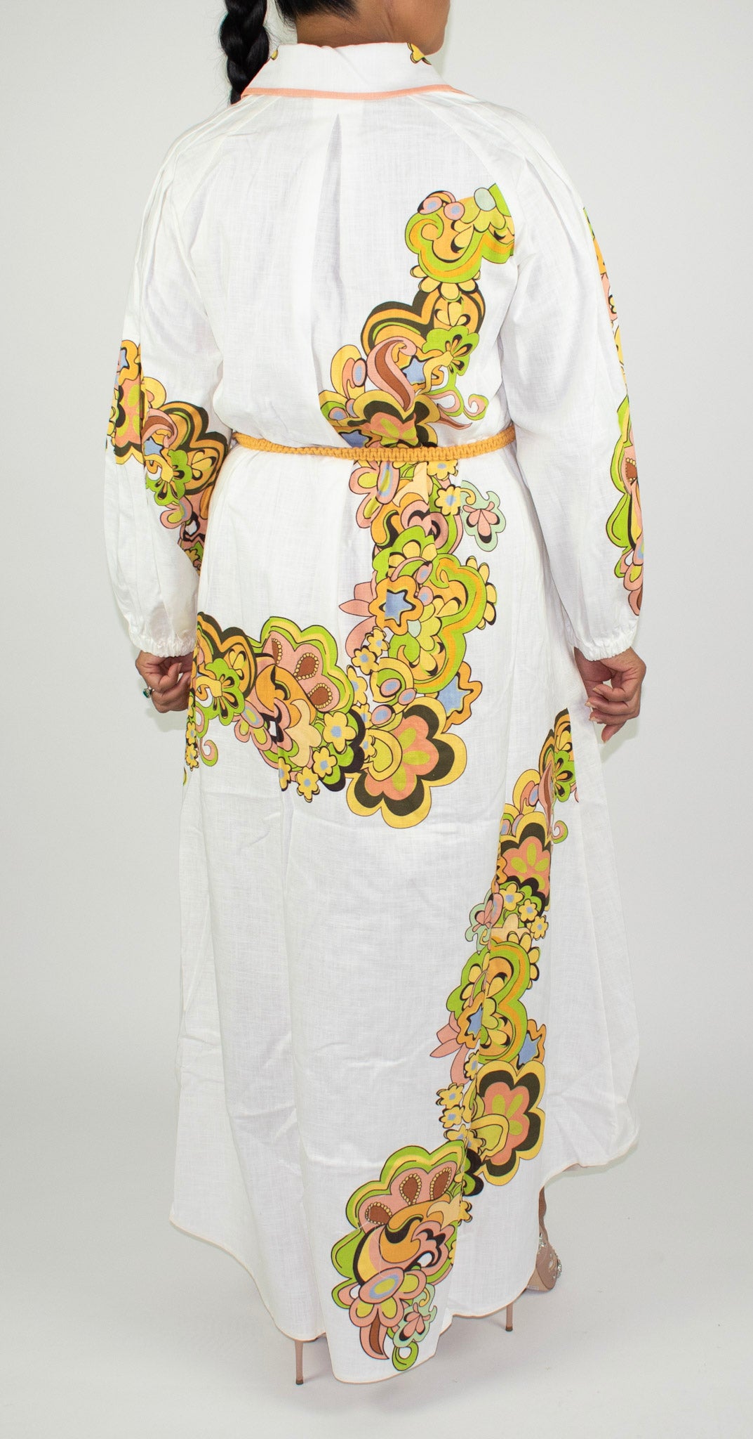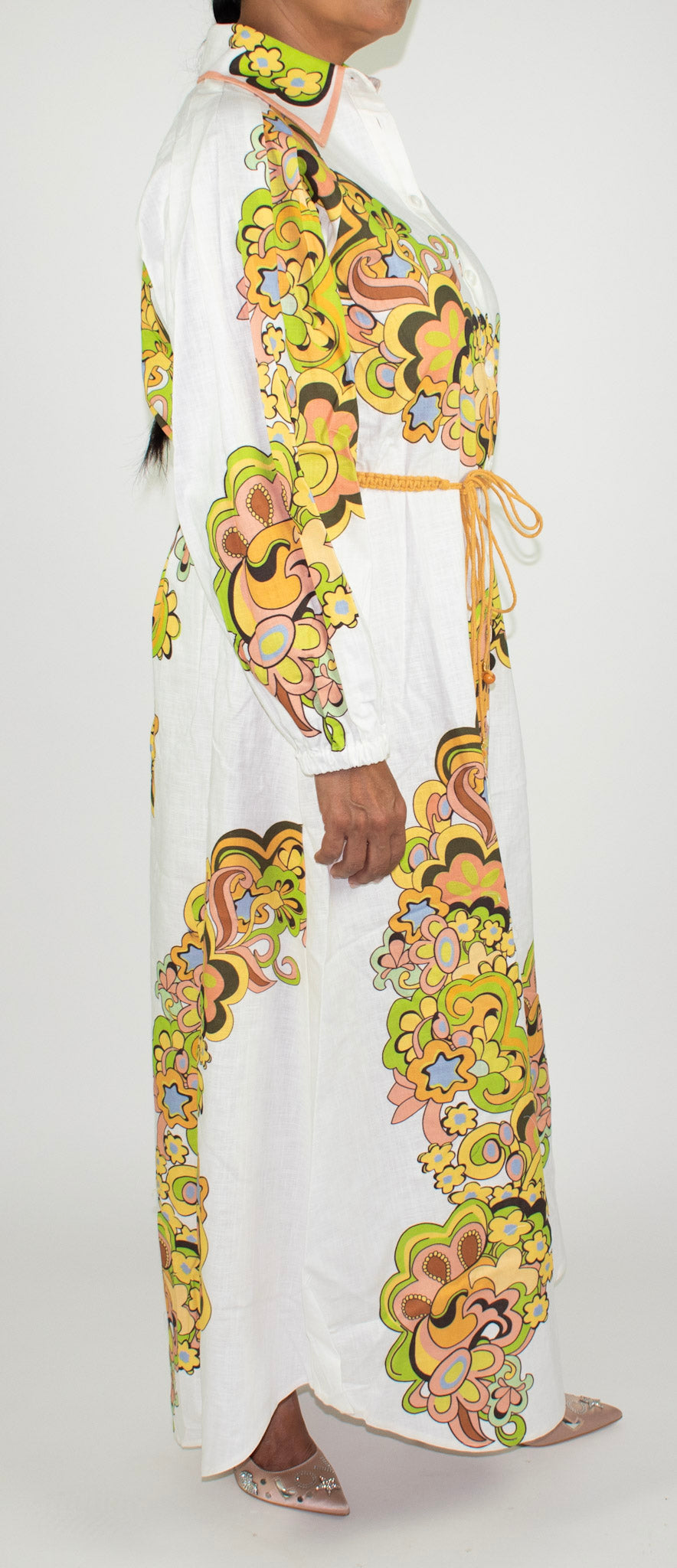 Beautiful full length, long sleeved dress in white with a yellow floral print.
